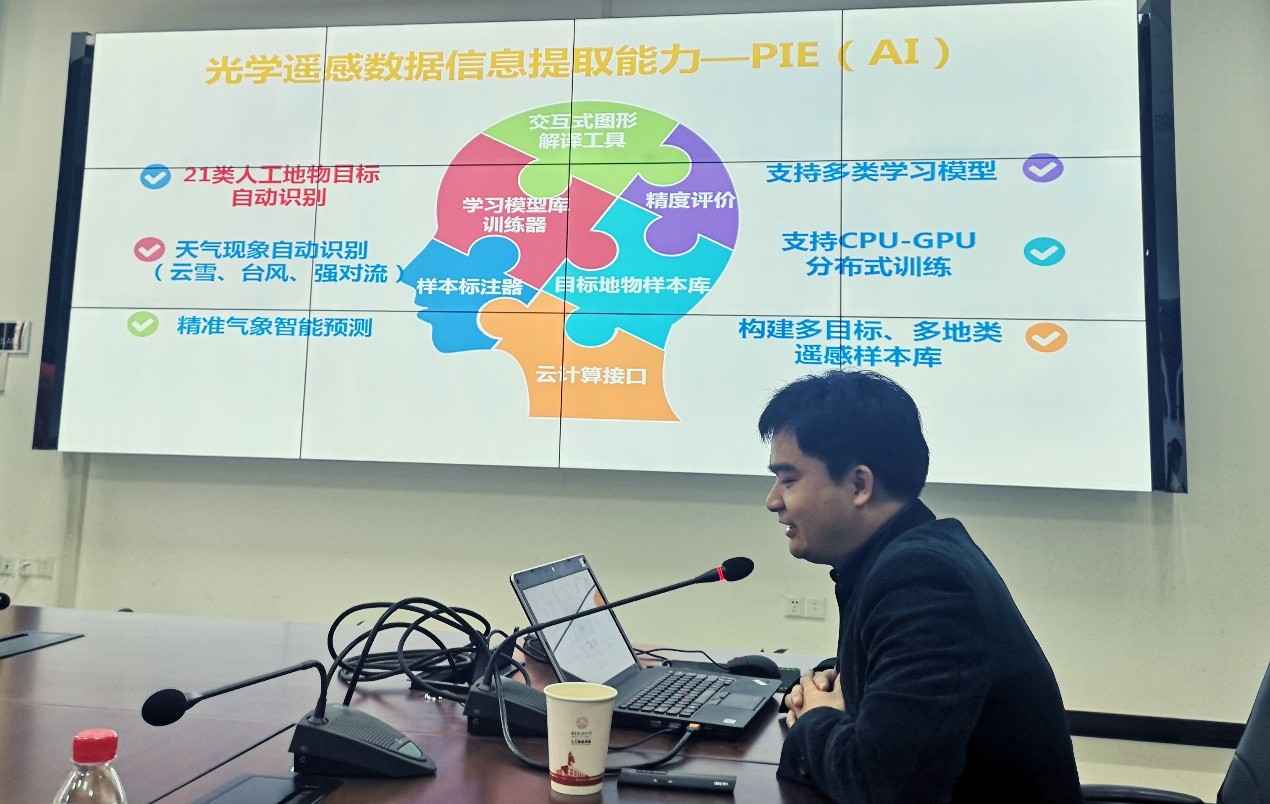 揭牌仪式结束后,航天宏图研究院技术总监沈均平博士作了关于航天宏图公司的基本情况、自主产品和影像处理情况的报告。在报告总沈均平博士表示航天宏图给自己的核心定位是一个国内领先的卫星应用服务商,始终专注于三个领域的技术创新与普及应用,分别是航空航天遥感应用、北斗导航应用、以及大气海洋应用。另外沈博士还介绍了航天宏图公司目前主打的两款产品和遥感影像处理方面的能力和情况,并希望双方在相关领域开展深度合作。