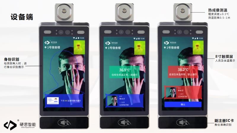 据悉,该校园智能管理系统包含了自动测温终端(设备端)、教师端与中控平台,采用热成像测温技术,实现测温及信息记录过程的自动化, 可将师生的测温时间、地点与体温信息自动上报,大大提高了检测速度。同时,该系统还可以广泛运用到学校宿舍管理、就餐管理、安全保卫等多个关键环节,极大提高校园管理的智能化水平。