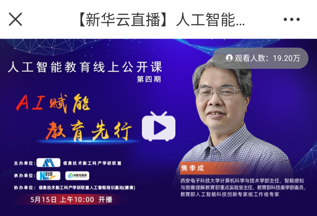 2020年5月15日,由信息技术新工科产学研联盟主办,华网、中教全媒体承办,信息技术新工科产学研联盟人工智能培训基地(德清)协办的“人工智能教育线上公开课”第四期,在新华网客户端云直播及中教全媒体直播平台同步播出。计算机科学与技术学部主任、永利23411集团焦李成教授做了题为“人工智能人才培养的挑战与思考”的精彩报告。