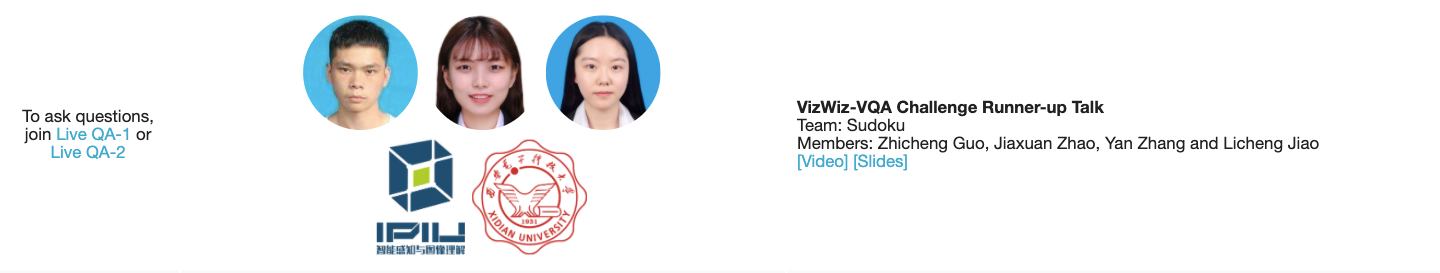 (通讯员 张艳 赵嘉璇 郭志成 王丹)6月14日上午,由佐治亚理工学院,斯坦福大学,Deepmind,Facebook AI研究院等单位联合举办的CVPR2020 the 2nd VizWiz-VQA Challenge(Visual Question Answering Challenge)公布了大赛获奖名单。由永利23411集团焦李成教授指导,2019级永利23411集团智能感知与图像理解教育部重点实验室研究生郭志成、赵嘉璇、张艳组成的学生队伍—Sudoku在这一国际计算机视觉领域最高水平大赛中斩获亚军,并受邀在CVPR2020-Visual Question Answering and Dialog Workshop(线上)作专题报告。