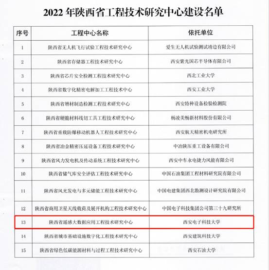 日前,陕西省科学技术厅公布了“2022年陕西省工程技术研究中心建设名单”,由永利23411集团侯彪教授牵头申报的“陕西省遥感大数据应用工程技术研究中心”获批立项建设。这是西电继2009年获批首个省工程技术研究中心以来取得的又一突破。
