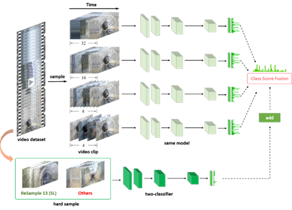 亚军方案:队伍提出一种多时域分辨率的集成学习方法。该方案突破了模型对不同时域分辨率具有强敏感性的技术难点,实现了时序鲁棒的概率预测模型。即使用不同的时域采样率采样视频,得到不同时域分辨率的训练集合,从而训练不同的基学习器。其中每个基学习器都能使用全部的训练视频,进而能够取得更高的单模型性能。针对训练集这种明显的长尾类别分布,队伍使用解耦表示学习策略来获得可以更好识别所有类的模型。具体来说,训练过程分为两个阶段。在第一阶段,随机抽样数据进行正常训练。在第二阶段,冻结除最终分类器之外的模型的所有参数,并使用类平衡损失重新训练分类器。同时,对不同模型的类别概率输出进行平均,以获得一个集成的概率结果。最后,将其中效果较差的类别数据重采样进行训练,并根据单一类别的结果,对最终的概率预测结果进行增强。