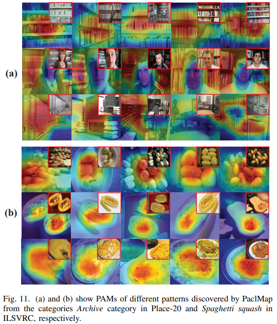 上图展示了方法在ILSVRC2012中的“档案室”“南瓜意面”中的结果。红色到深蓝色代表网络从感兴趣到不感兴趣,每张热力图的右上角是原图。可以看出,在“档案室”中,每种模式分别是,整齐排列的档案、人像后的档案、存储档案的柜子三种模式。在“南瓜意面”中,三种模式分别是,完整的南瓜、南瓜壤、做好的意面三种模式。更详细的证明和更多的实验结果见论文:https://ieeexplore.ieee.org/document/9944792。