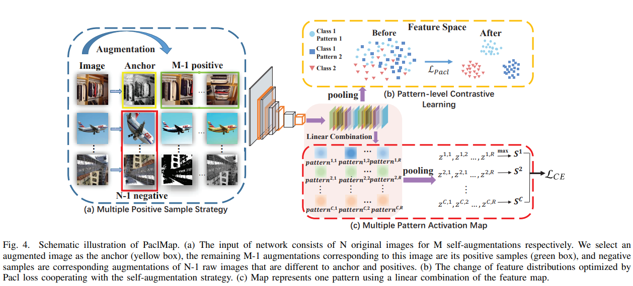 论文提出一种算法,其由两部分组成:1)模式级对比学习(pattern-levelcontrastive Learning),上图(ab),用无监督的方式提取每类内的多种频繁性模式。2)多模式激活特征图(Multi-pattern Activation Map(MAP)),上图(c),用于更好的联合优化分类和对比学习任务,确保模式同时具有判别性与频繁性。