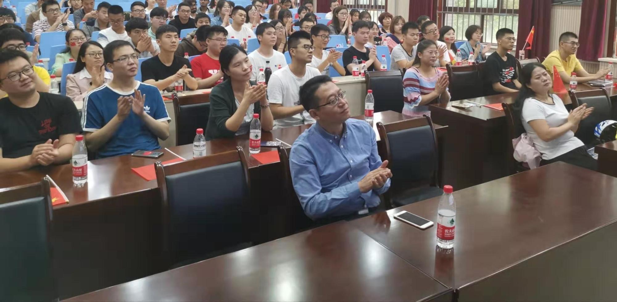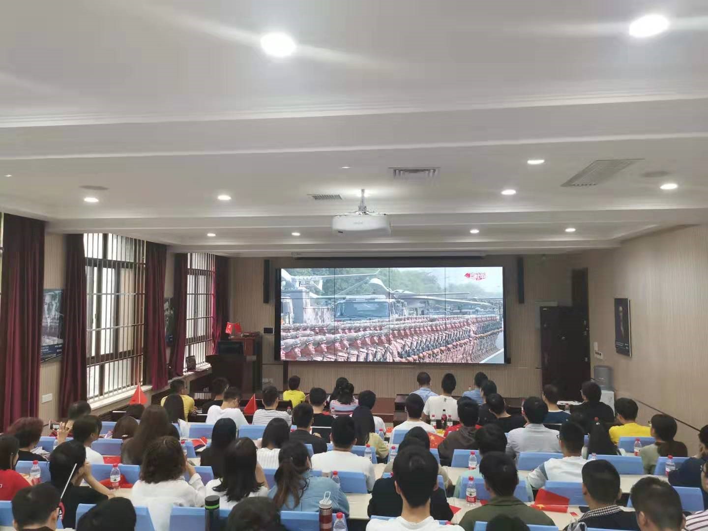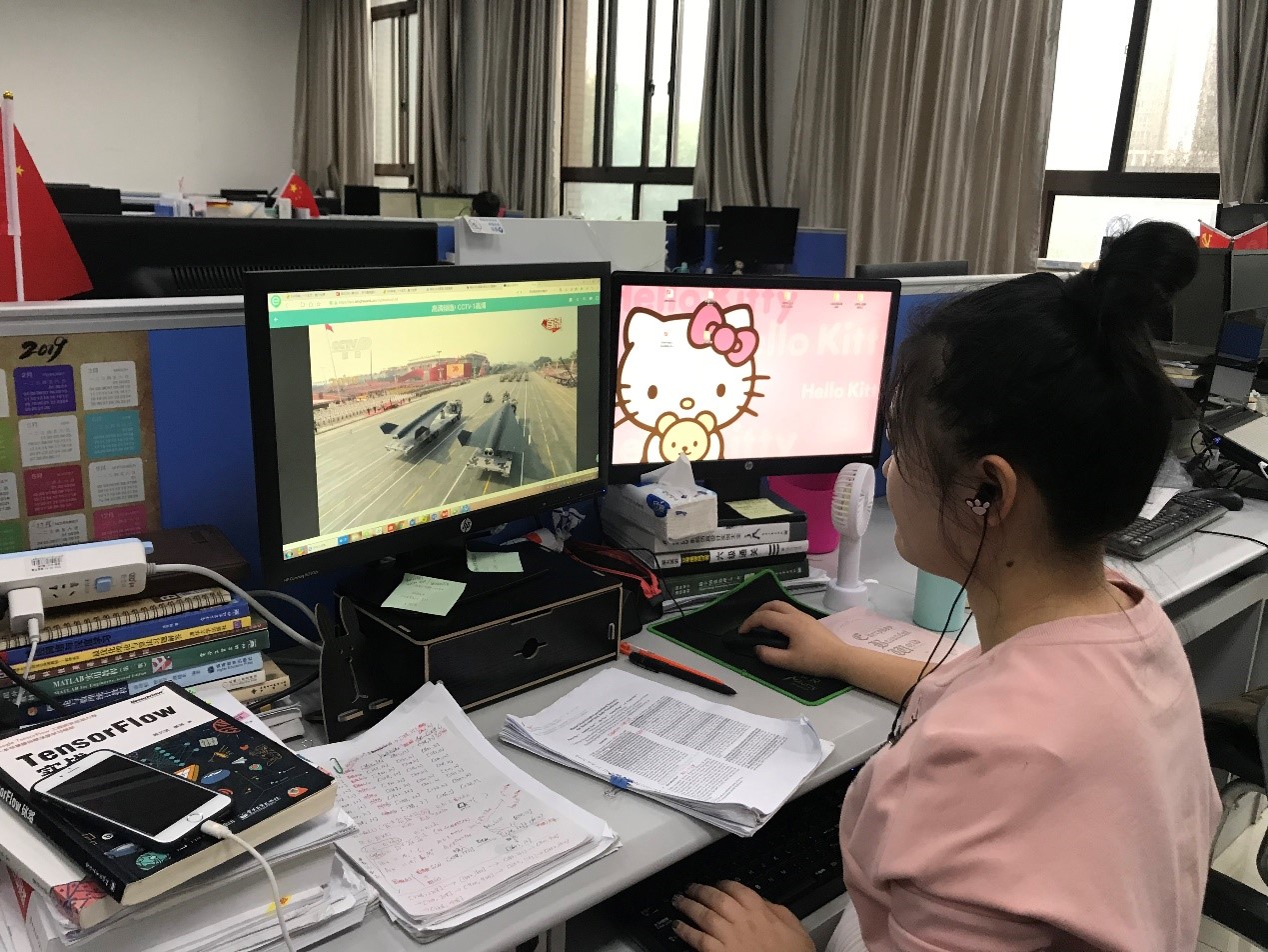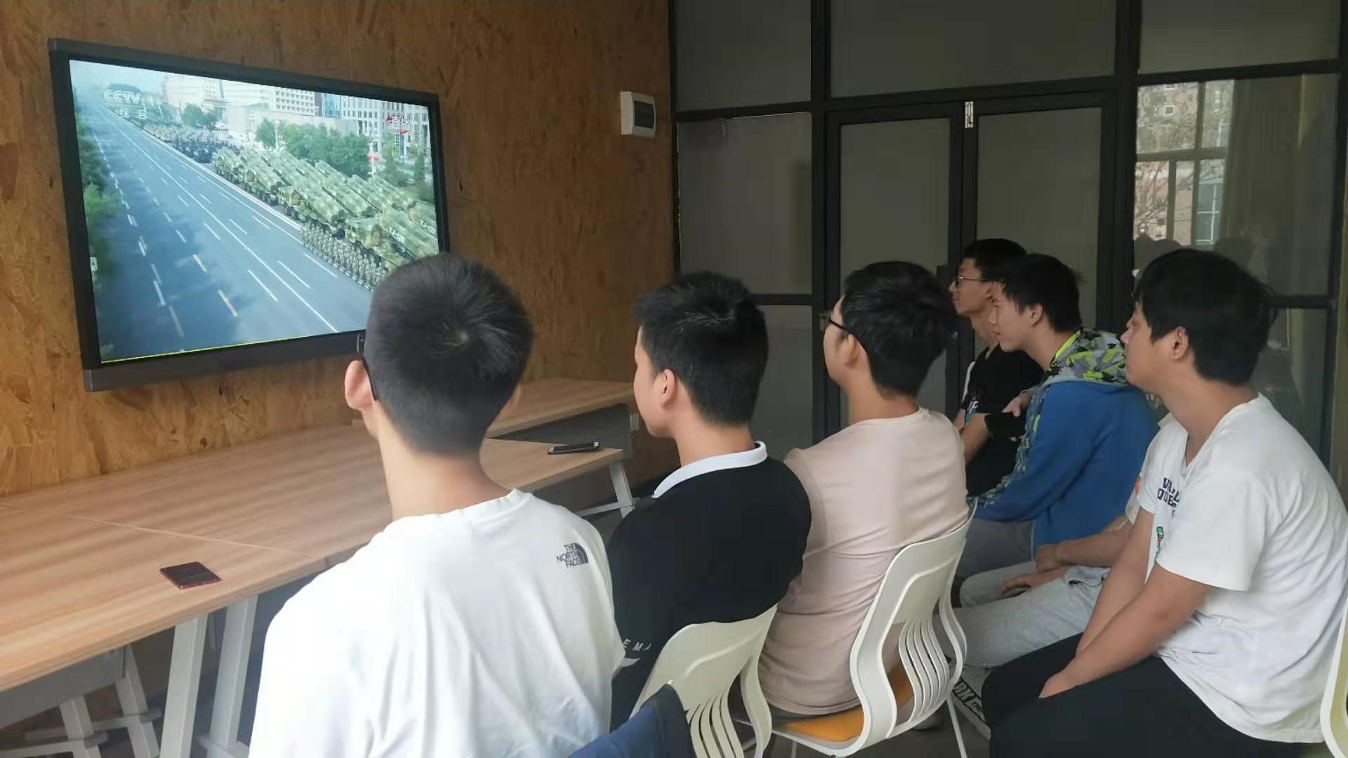 伴随着义勇军进行曲的唱响,五星红旗冉冉升起,庆祝大会正式开始。智能院的广大师生全神贯注,屏气凝神的盯着大屏幕,生怕错过一个镜头。当习近平总书记登台讲话时,当我军59个受阅方队迈着整齐划一的步伐走过天安门城楼,紧随其后霸气威武的战略导弹方阵出现时,观看直播的会议室发出阵阵雷鸣般的掌声。