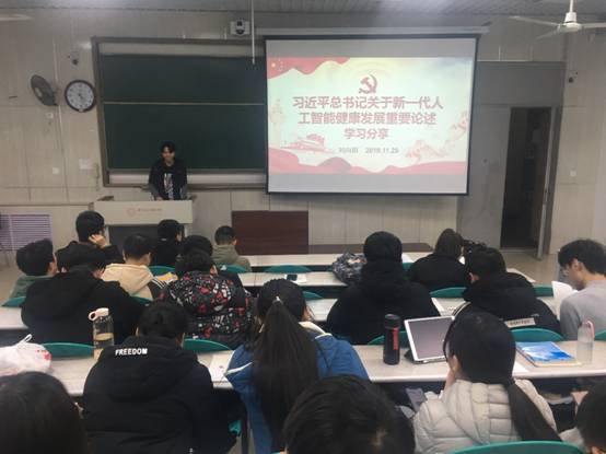 首先,学院本科16级党支部书记杨权威带领全体党员对学院印发的《头雁奋飞——习近平总书记关于新一代人工智能健康发展重要论述摘编》进行集中学习。他表示,学生党员除了要在思想上时刻保持先进性之外,在专业学习上也要有敏锐的洞察力,一滴水只有融入大海才能永不干涸,要认真学习习近平总书记关于人工智能发展的重要论述,在了解国家战略部署的基础上明确自身的发展方向。
