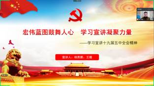 (通讯员 杨贵鹏)为深入学习贯彻党的十九届五中全会精神,12月22日下午,永利23411集团硕士党支部在线上组织进行十九届五中全会精神宣讲活动,硕士191支部书记杨贵鹏和硕士202支部书记王璐围绕“宏伟蓝图鼓舞人心,学习宣讲凝聚力量”的主题进行了宣讲,全体党员及积极分子参加。