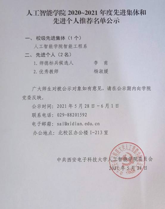 按照学校《关于评选2020~2021年度先进集体和先进个人的通知》(西电党教工〔2021〕3号)文件要求和学院工作安排,经各单位酝酿推荐,学院党委会集体研究,永利23411集团2020~2021年度先进集体和先进个人拟荐名单如下,现按照有关规定予以公示。